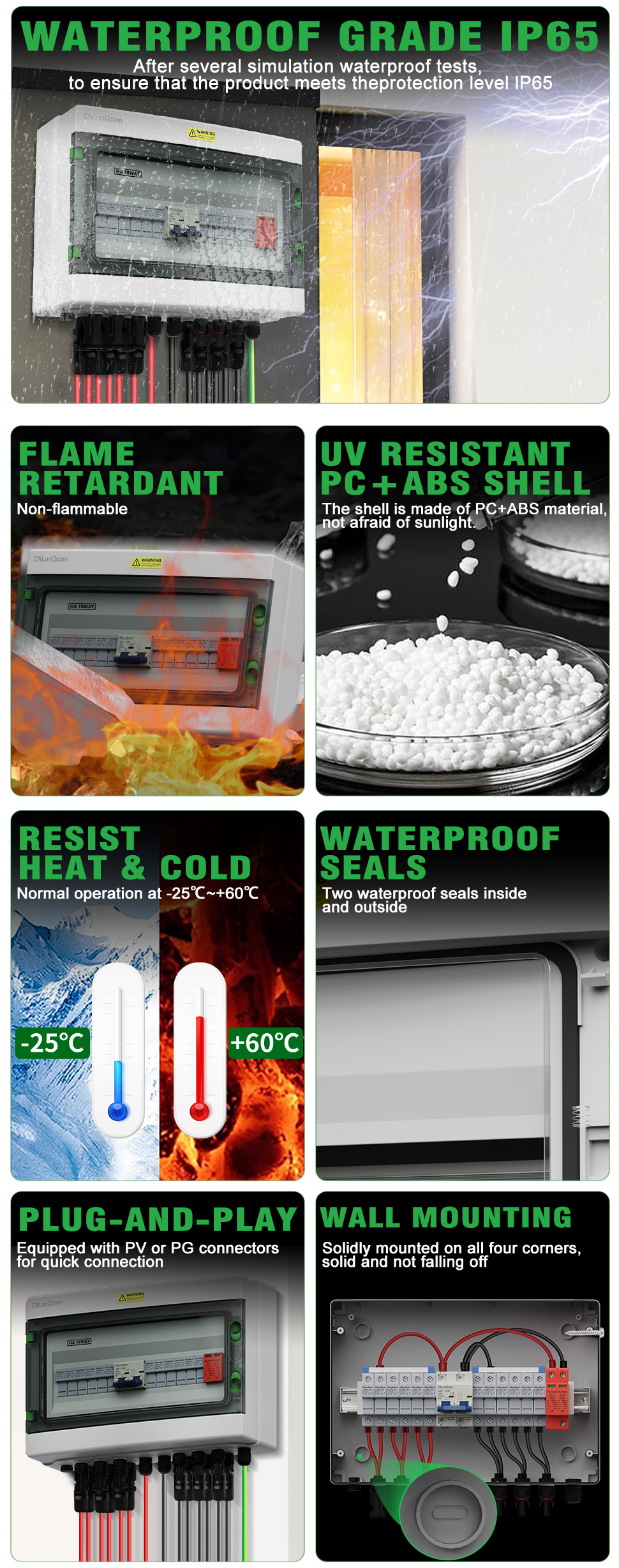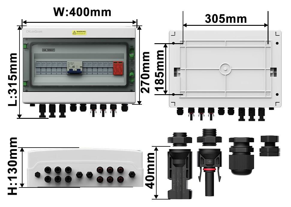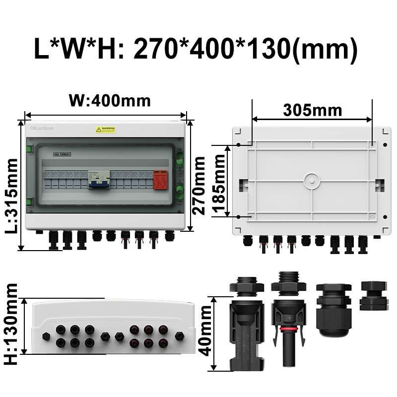 CNLONQCOM యొక్క HA సిరీస్ ప్లాస్టిక్ పివి కాంబైనర్ బాక్స్ 6in 1 అవుట్ DC500V కి సీల్డ్ నిర్మాణం, ఓవర్లోడ్ రక్షణ, షార్ట్ సర్క్యూట్ రక్షణ, ఓవర్ వోల్టేజ్ రక్షణ, ధూళి, తేమ మరియు మెరుపు రక్షణతో పిసి+ఎబిఎస్ వాటర్ఫ్రూఫ్ కేసు ఉంది.