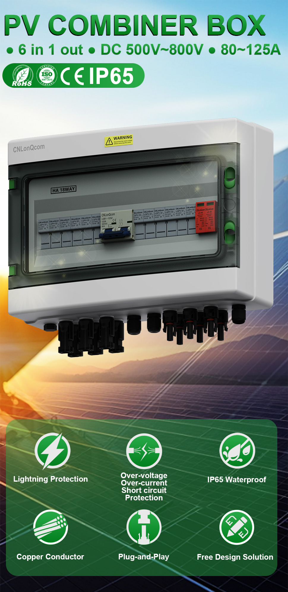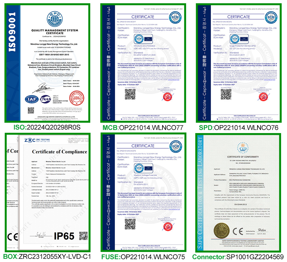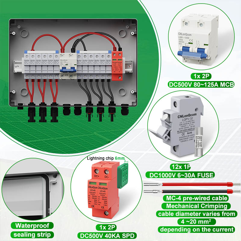 CNLONQCOM యొక్క HA సిరీస్ ప్లాస్టిక్ పివి కాంబైనర్ బాక్స్ 6 ఇన్ 1 అవుట్ DC500V/600V/800V ప్రధానంగా పివి వ్యవస్థల రక్షణ కోసం ఉపయోగించబడుతుంది మరియు తరచుగా ఆఫ్-గ్రిడ్ లేదా గ్రిడ్-కనెక్ట్ చేయబడిన వ్యవస్థలలో ఉపయోగించబడుతుంది. పివి ప్యానెల్లు, ఆర్వి, బోట్, అవుట్డోర్ పివి, గృహ, మొదలైనవి.